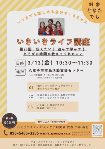 健康福祉公開日:2026年03月08日第29回いきいきライフ講座「伝えたい!遊んで学んで!遊びの時間が教えてくれたこと」開催日:2026年03月13日(金)