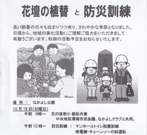 公開日:2025年10月26日明神町なかよし公園花壇の花の抜き取りと防災訓練2025年10月19日 明神町なかよし公園に6月2日に植えた花を抜き取り、整地します。 明神町二丁目...