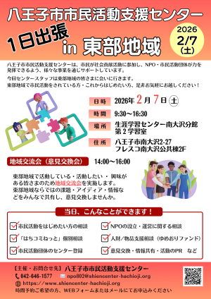 公開日:2026年01月08日八王子市市民活動支援センター1日出張 in 東部地域開催日:2026年02月07日(土)