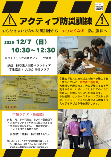 | イベント・講座名 | <支援講座>2025年度 アクティブ防災訓練~もしセンターで、大地震が発生したら? |