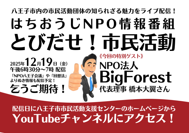 イベント終了<YouTubeライブのお知らせ>12/19(金)配信はちおうじNPO情報番組 とびだせ!市民活動八王子市内の市民活動団体の知られざる魅力をライブ配信!