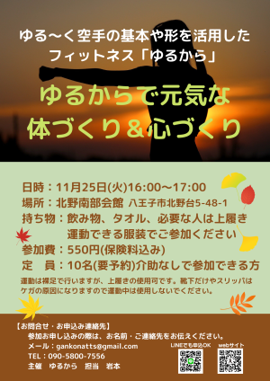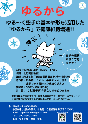 12月のゆるから定期講座を開催します。無理なく続けられる運動で、寒い季節も元気に過ごしましょう。初心... -