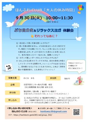 今回の【大人の休み時間】は、ぷち自分史&リラックスヨガ体験会! ほんふわCLUBの2つのメニューの体...